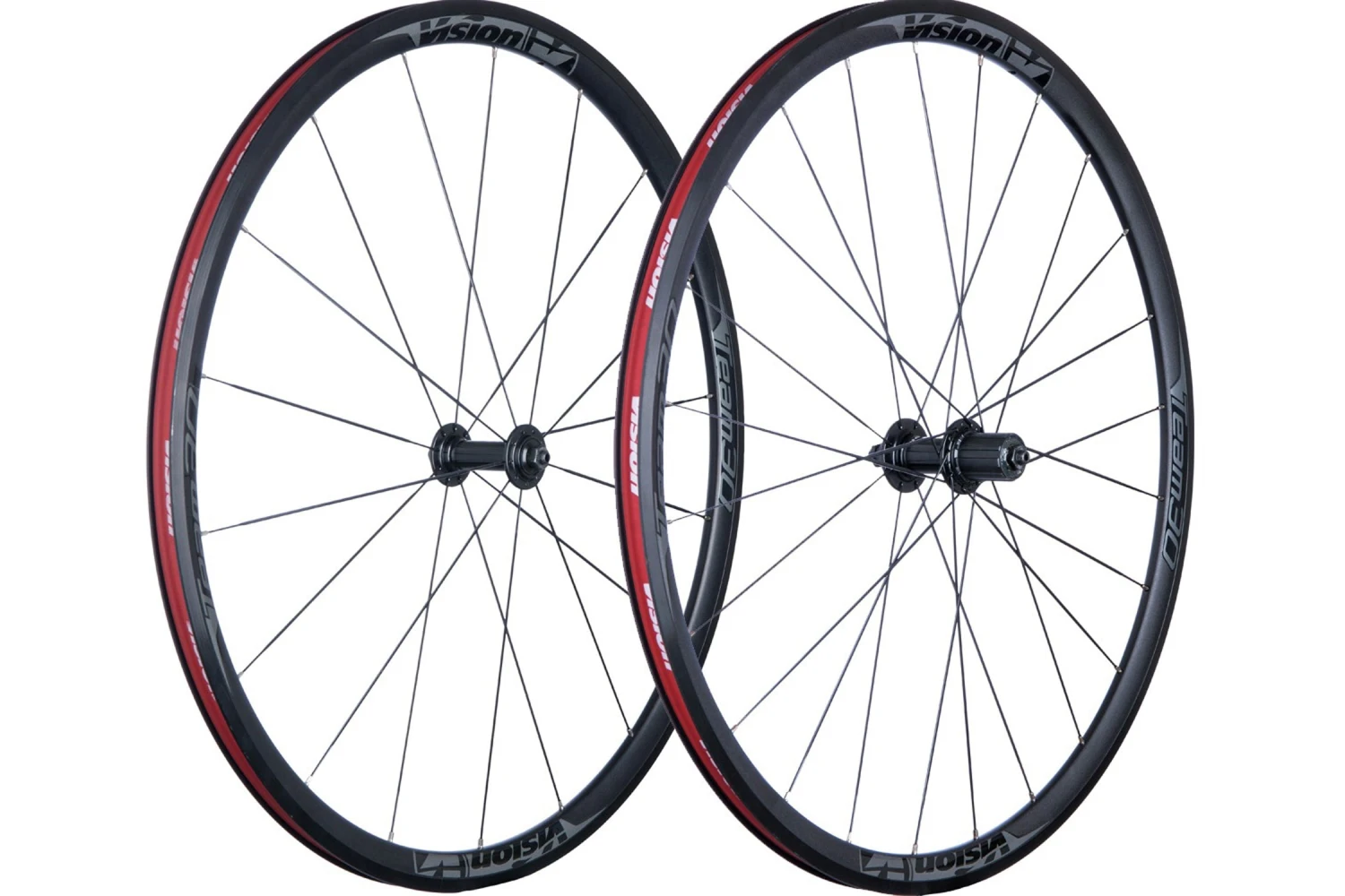 Our most affordable wheelset, the Team30 COMP has semi-aero 30mm deep aluminum clincher rims laced to alloy hubs. The rims are CNC machined for an even braking surface and consistent control. Spokes are conventional J-bend items, laced asymmetrically at the rear: 3-cross on the drive side, radial on the non-drive side. Adjustable loose ball bearings roll smoothly and make for easy maintenance. Like our high-end wheels, the Team 30 Comp is built entirely by hand by expert wheelbuilders, ensuring long-term reliability.